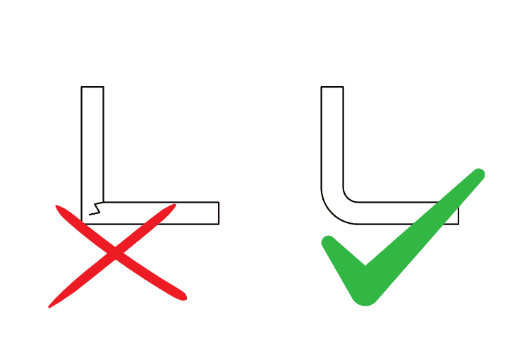 - Gebruik afgeronde hoeken (binnenradius ± 0,5x wanddikte) voor een betere materiaaldeling en minder kans op scheuren.